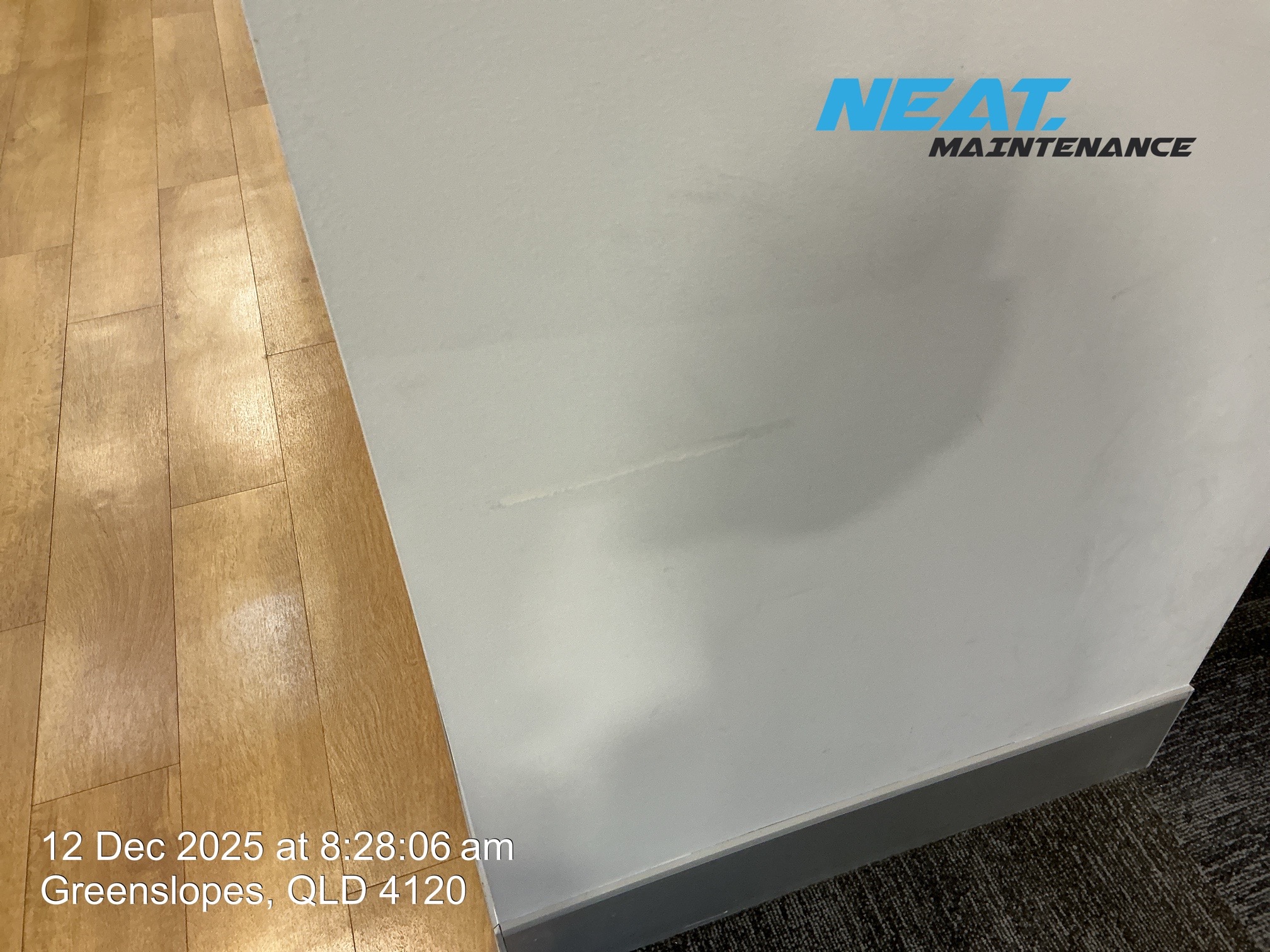 This is area in reception under desk where water is coming in ?? which is still under investigation. Did not repair or repaint this area.